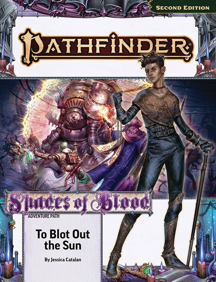 To Blot Out the Sun is a Pathfinder Adventure for four 7th-level characters. This adventure concludes the Shades of Blood Adventure Path, a three-part monthly campaign in which a group of adventurers explore a ruined ancient prison to stop a vampiric threat to cover the skies in shadow. This volume includes a look at a Nin, patron of the campaign’s villain and god of mathematical laws of undeath, reveals unsolved mysteries, delves deeper into vampires, and provides a toolbox of magical contraptions and techniques as well as a bestiary of shadowy monsters.