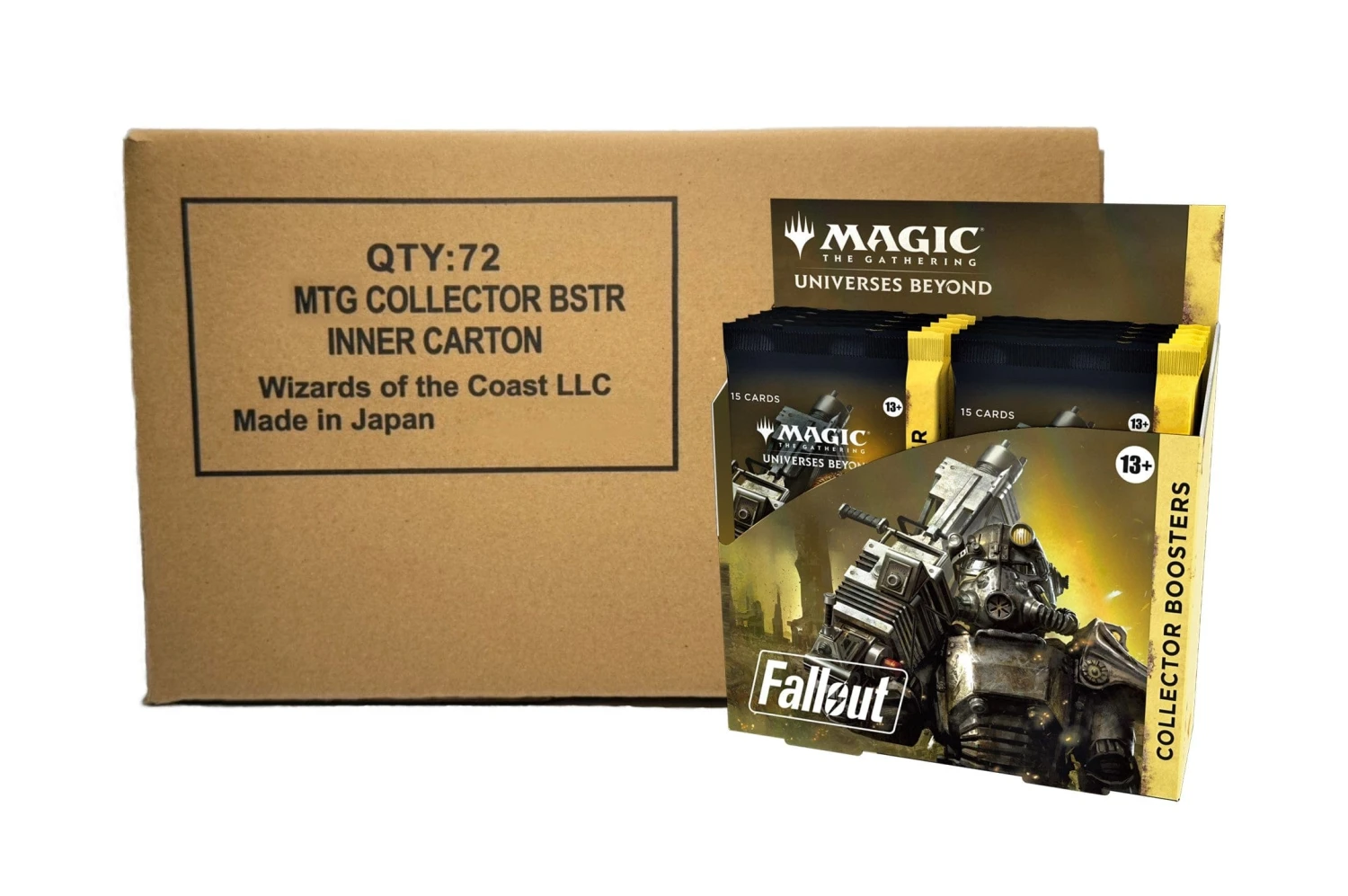 The vault is open! These boosters are so overstuffed with perks for Fallout fans, theyll test the limits of your carrying capacity. Expect to encounter Rares and/or Mythics, Traditional Foils, Extended-Art cards, and special Fallout-themed card treatments. This Magic: The Gathering-Fallout Collector Booster Box contains 12 Fallout Collector Boosters.